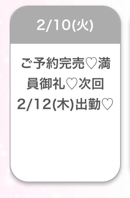 | 2月10日(火) | 2/10(火)体験入店初日★ご予約完売♡満員御礼♡ |